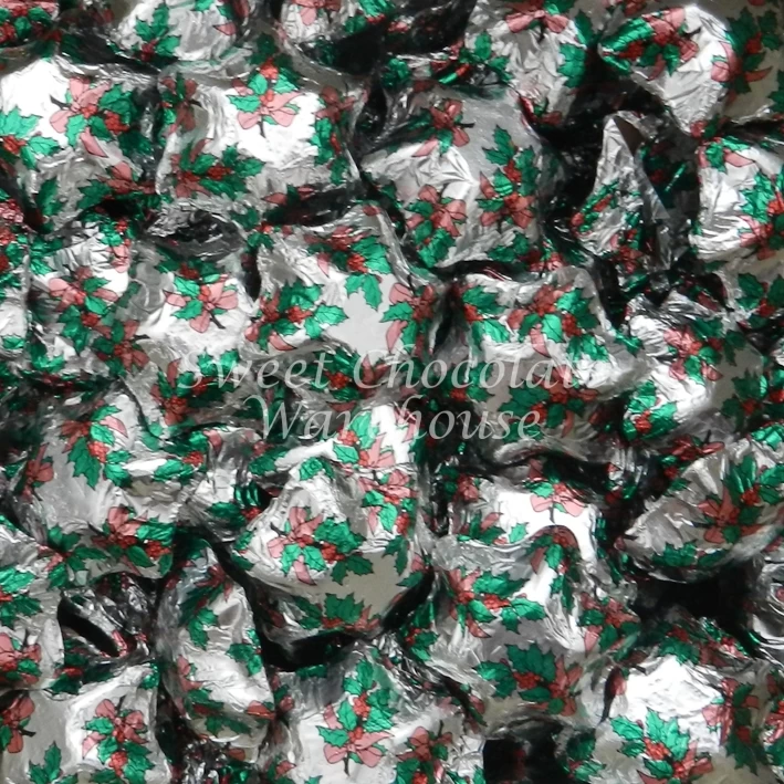 - Milk Chocolate Stars wrapped in Christmas Holly Silver Coloured foil 1kg