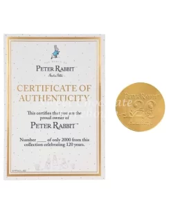 - The Peter Rabbit 120th Anniversary numbered limited edition plush is beautifully wrapped in printed tissue paper and sealed with a gold foil embossed 120th Anniversary sticker. The plush comes with a Certificate of Authenticity and the printed box includes iconic illustrations and artwork with gold foil accents giving it a premium look and feel. Each plush includes a leatherette tag which is numbered and corresponds to the certificate. Plush is made from premium plush fur and features high character detailing. Collectable, giftable and to be treasured for years to come.