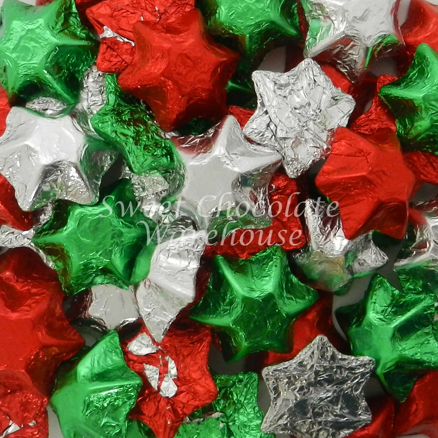 - Milk Chocolate stars wrapped in Red, Silver & Green Coloured foil 1kg
